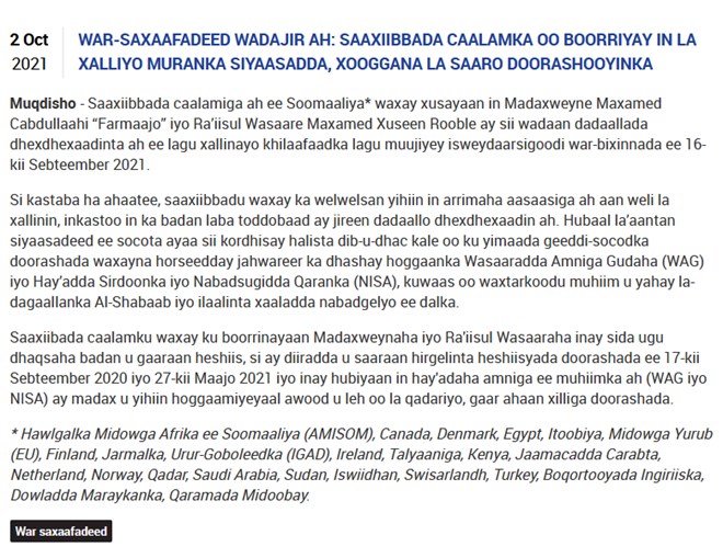 Sabti, October, 2, 2021 (HOL) - Beesha caalamka ayaa mar kale ugu baaqday Madaxweyne Farmaajo iyo Ra’iisul wasaare Rooble in ay ka heshiiyaan khilaafka dhexdooda ayna sii wadaan dadaallada dhexdhexaadinta ah ee lagu xallinayo khilaafaadka.