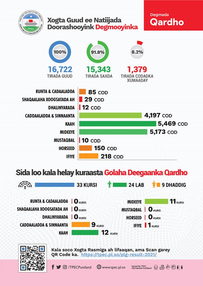 Urur siyaasadeedka Kaah oo guddoomiye uu u yahay madaxweynaha Puntland, ayaa 12 kursi ka helay doorashada ka dhacday magaalada Qardho, halka ururka Mideeye oo kusoo xigay uu helay 11 kursi, sidoo kale ururka Sinnaan iyo caddalad ayaa helay 9 kursi.