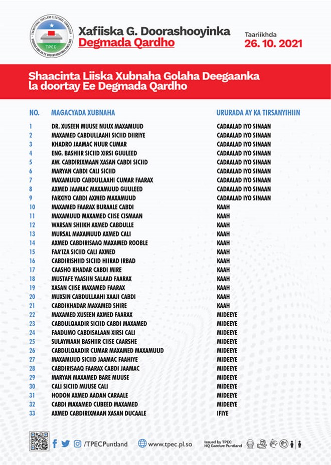 Talaado, October, 26, 2021 (HOL) - Guddiga doorashada Puntland ayaa ku dhawaaqay natiijada doorashadii ka dhacday magaalada Qardho ee xarunta gobolka Karkaar iyo ururada ku guulaystay kuraasta xildhibaannada golaha deegaanka.