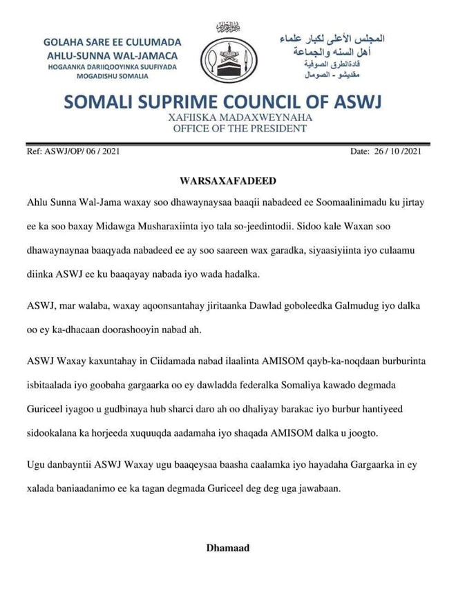 Dhinaca kale, Ahlusunna Waljamaaca oo ka hadashay colaadda Guriceel ayaa shaacisay in ay soo dhoweynayaan baaqyada nabadeed ee lagu dalbanayo joojinta colaadda Guriceel.