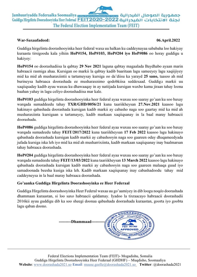 Arbaco, April, 6, 2022 (HOL) - Guddiga doorashooyinka heer Fedaraal ayaa goordhaw War rasmi ah kasoo saaray sababahii ay u hakiyeen afar kursi oo ka mid ahaa kuraasta Golaha Shacabka Baarlamaanka Fedaraalka Soomaaliya, kuwaas oo kala ah HOP 154, HOP 103, HOP 204 HOP 086.