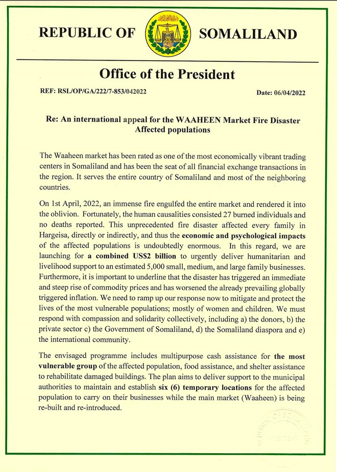 Arbaco, April, 6, 2022 (HOL) - Baaq ay soo saartay xukuumada Somaliland oo uu ku saxeexanyahay maxaxweyne Muuse Biixi Cabdi, ayaa beesha caalamka, ganacsatada iyo qurbjoogta lagaga codsaday in ay gacan ka gaystaan taakulaynta dadkii ku waxyeeloobay dhibaatada dabka baabiiyay suuqa Waaheen.