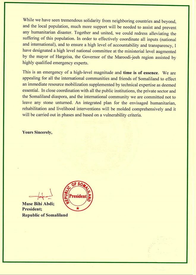 "Waxaynu u baahanahay in aynu si wayn uga jawaabno, si aynu wax uga qabano, isla markaana u bad baadino, nolosha kuwa ugu jilicdasan, oo u badan dumar iyo caruur, waa in aynu kaga jawaabnaa naxariis iyo wadajir, deeq-bixiyayaasha, ganacsatada, dowlada Somaliland, qurbajoogta Somaliland iyo beesha caalamka" ayaa lagu yidhi baaqa.