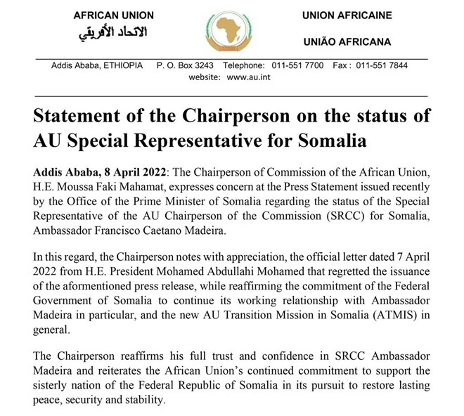 Sabti, April, 9, 2022 (HOL) - Guddiga Midowga Afrika ayaa walaac weyn ka muujiyay War-Saxaafadeed dhawaan ka soo baxay Xafiiska Ra’iisal Wasaaraha Soomaaliya, kaasoo ku aadanaa eryida Wakiilka Midowga Afrika ee Soomaaliya, Danjire Francisco Caetano Madeira.