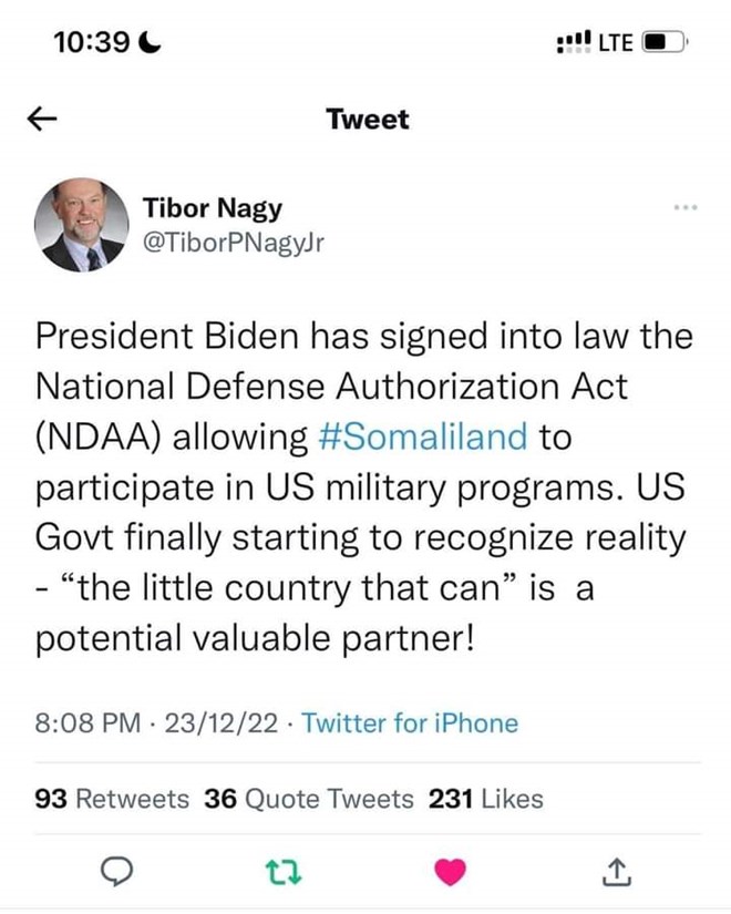 "Madaxweyne Biden waxa uu saxeexay Xeerka Oggolaanshaha Difaaca Qaranka ee NDAA, kaasi oo ogolaanaya in Somaliland ay ka qaybqaadato barnaamijyada millateriga Maraykanka, dowlada Maraykanku ugu danbayntii xaqiiqda ayay ogaatay, 'Waddanka yar ee awooda', waa saaxiib qiimo leh" ayuu yidhi Nagy.