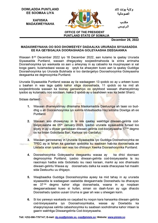 Talaado, December, 27, 2022 (HOL) - Madaxweynaha Puntland Siciid Deni ayaa ka diiday ururada siyaasada in wax ka beddel lagu sameeyo labo qodob oo katirsan xeerka doorashada.