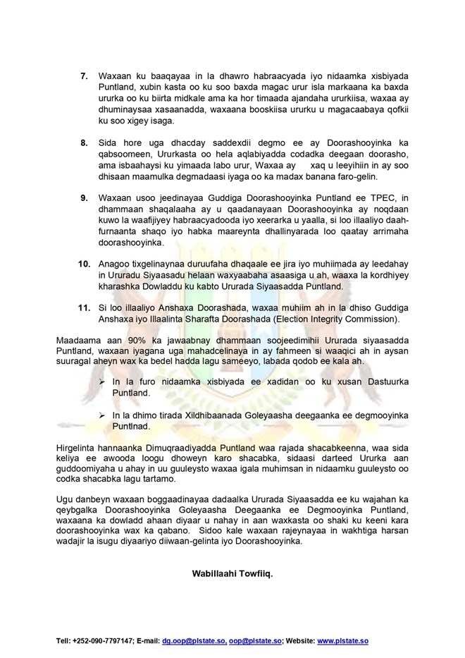 newsinsideLabadan qodob ayaa ah in la furo nidaamka xisbiyada xaddidan ee dastuurka Puntland uu dhigayo, iyo in la dhimo tirada xildhibaannada golayaasha deegaanka ee degmooyinka Puntland