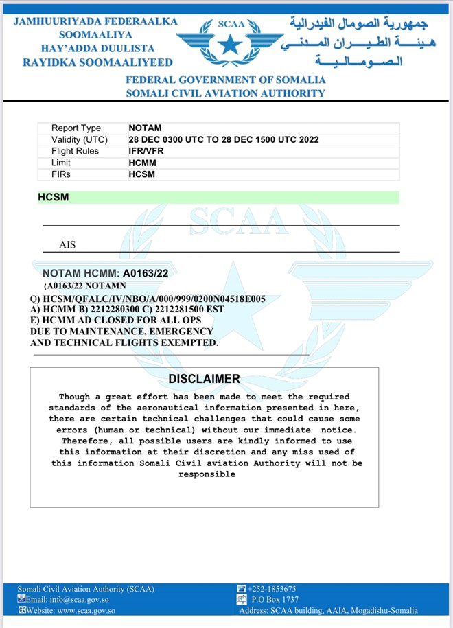 newsinsideQoraal kasoo baxay Hay’adda Duulista Rayidka ee Soomaaliya ayaa lagu sheegay, in arrimo farsamo awgeed loo joojiyay dhaqaaqyada duulimaadyada garoonka Aadan Cadde.