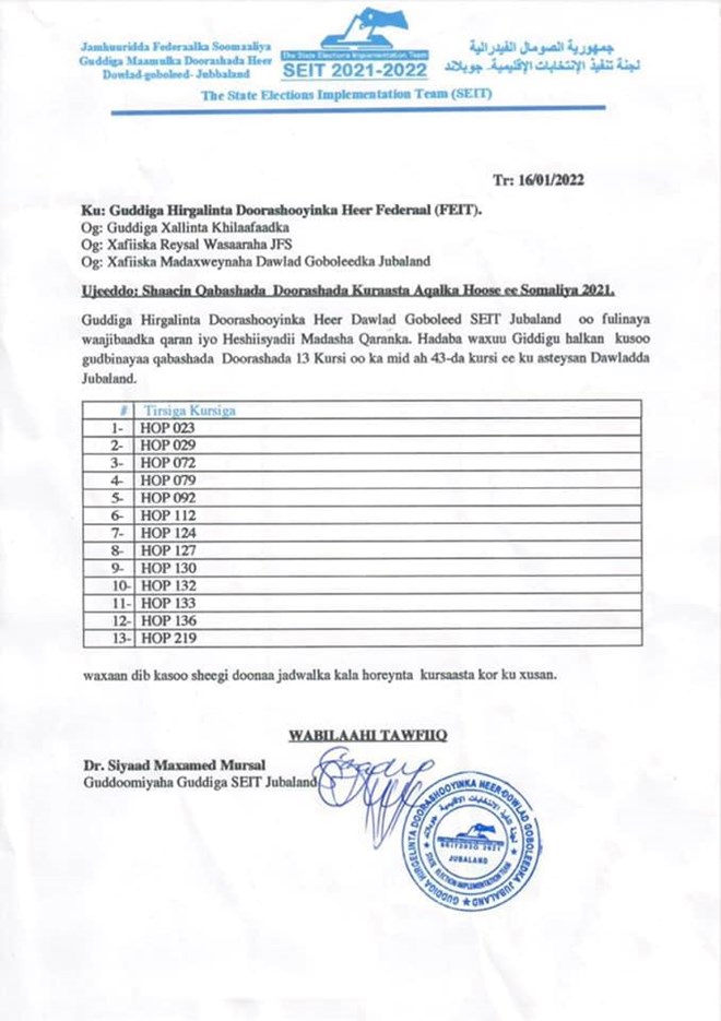 Isniin, Janaayo, 17, 2022 (HOL) - Guddiga hirgelinta doorashooyinka maamulka goboleedka Jubbaland ayaa shaaciyay liiska 13 kursi oo ka mid ah kuraasta Golaha Shacabka ee deegaan doorashadoodu tahay Jubbaland.