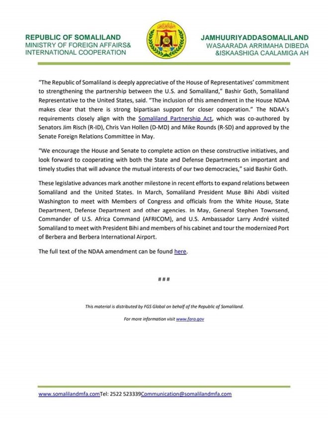 "Jamhuuriyada Somaliland waxay u sacabtumaysa meel-marinta Golaha Wakiilada Maraykanka ku sameeyeen xeerka ogolaanaya in wasaarada arrimaha dibaddu ay samayso cilmi-baadhis iyo ka warbixin xidhiidh amaan oo ay yeeshaan Maraykanka iyo Somaliland" ayaa lagu yidhi warsaxaafadeedka.