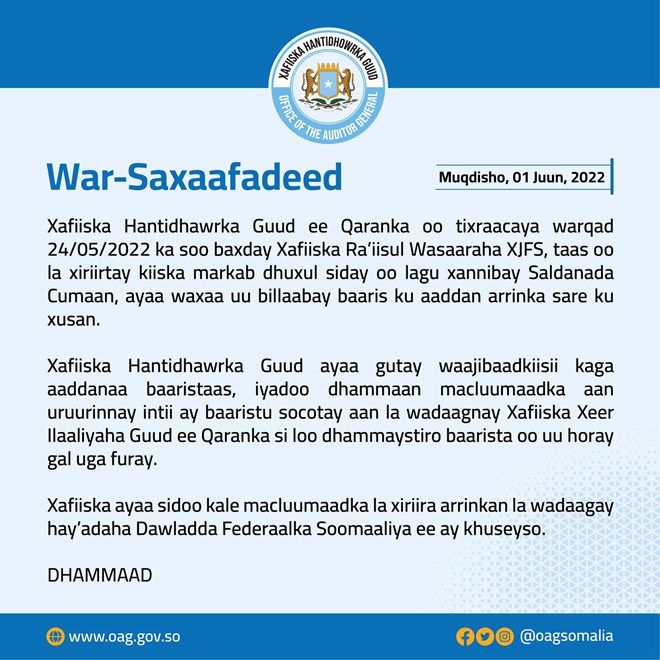 Hoos ka akhriso War-saxaafadeedka Kasoo baxay Xafiiska Hantidhawrka Guud ee Qaranka:-