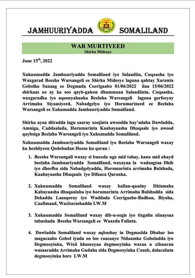 Khamiis, Juun, 16, 2022 (HOL) - Xukuumada Somaliland iyo beelaha bariga Sanaag, ayaa gaadhay heshiis ay beeshu si buuxda ugaga mid noqonayso Somaliland, isla markaana si lamid ah shacabka kale ee Somaliland ay dhib iyo dheefba Somaliland la qaybsato.