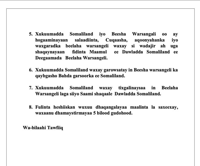 Afahayeenka ayaa sheegay in lagu heshiiyey in beeshu si buuxda uga mid noqoto Somaliland "Beesha Warsangali waxay si buuxda uga midtahay beelaha J. Somaliland, waxayna la wadaagtaa dhib iyo dheef sida nabadgalyada, horumarinta iyo kaabayaasha dhaqaalaha, iyo difaaca qaranka".
