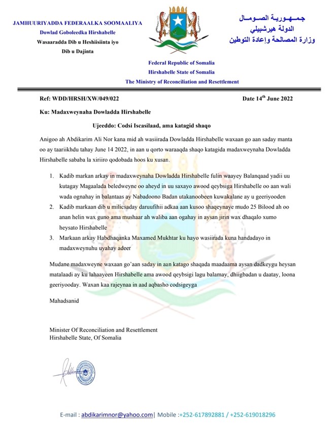 newsinsideCabdikariin Cali Nuur ayaa warqadiisa is casilaada u gudbiyay madaxweynaha Hirshabeelle Cali Guudlaawe Xuseen, sida ku cad warqada is casilaada ee uu qoray Cabdikariin Cali Nuur 14-kii bishaan Juun 2022.