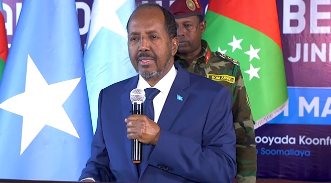 Khamiis, Juun, 2, 2022 (HOL) - Madaxweynaha Soomaaliya Xasan Sheikh Maxamuud ayaa ku eedeeyay ururka Alshabaab inay dadka ku gobolka Baay u diideen inay wax tabcadaan, isagoo sheegay inay masuul ka yihiin inay dadku gacmahooda hoorsadaan.