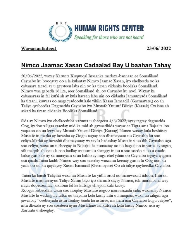 Khamiis, Juun, 23, 2022 (HOL) - Gabadh lagu magacaabo Nimco Jaamac Xasan oo ah 16 sanno jir degan magaalada Caynaba ee Somaliland, ayaa sheegtay in ay kufsadeen askar booliis ah, waxayna dalbatay cadaalad.