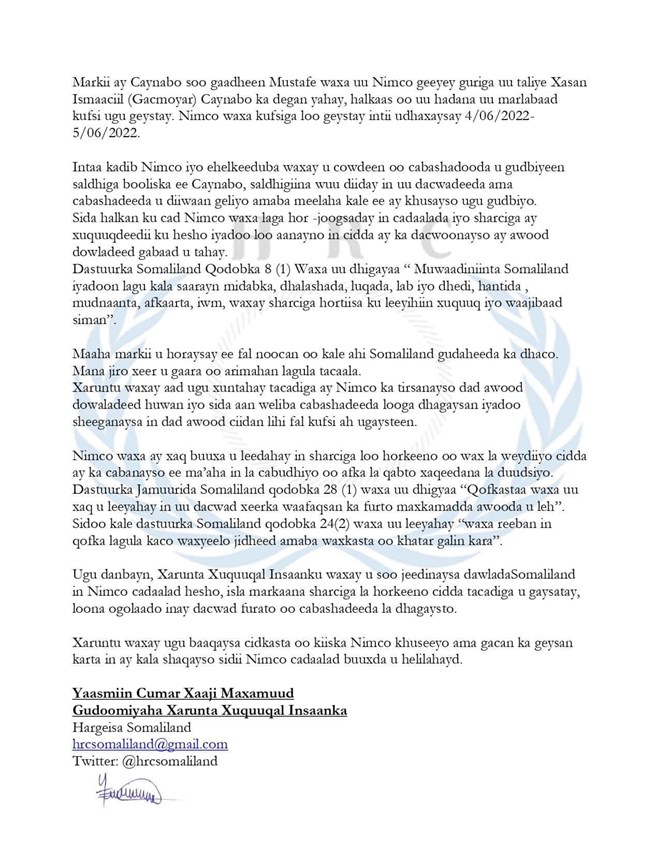 newsinsideSida lagu sheegay warbixin ay soo saartay Xarunta Xuquuqal Insaanka Madaxabannaan ee Somaliland, oo saraakiil ka tirsani booqasho ugu tageen gabadha, ayaa lagu sheegay in Nimco ay sheegtay in laba askari oo booliis ahi ay kula kaceen fal kufsi ah.