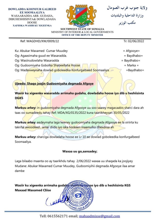 Jimco, Juun, 3, 2022 (HOL) - Wasiir ku xigeenka wasaaradda arrimaha gudaha maamulka Koonfur Galbeed Soomaaliya anha ku simaha wasiirka wasaaradda arrimaha gudaha Maxaad Maxamed Ciise ayaa shaqo joojin ku sameeyay guddoomiyaha degmada Afgooye ee gobolka Sh/hoose Abuukar Maxamed Cumar.
