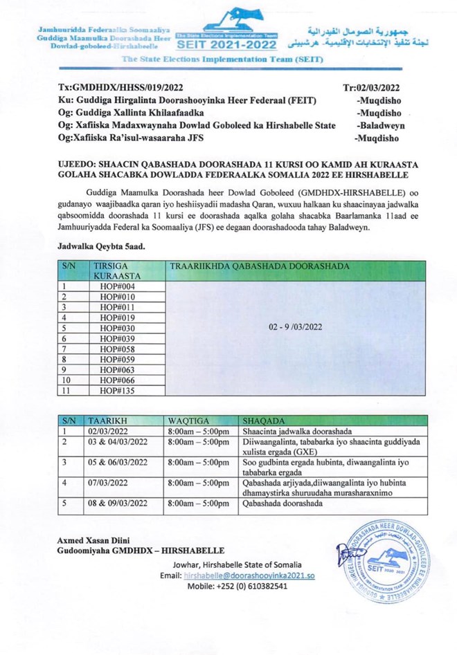 newsinsideWar qoraal ah oo kasoo baxay guddiga doorashada Hirshabeelle ayay ku sheegeen in 7-da bishaan oo ku beegan Maalinta Isniinta ah ee soo socota inay bilaaban doonto diiwaan gelinta Musharaxiinta, islamarkaana maalmaha Talaadada iyo Arbacada oo taariiqdu tahay 8-da ilaa 9-ka bishaan Maarso ay dhici doonto doorashada 11-ka kursi.