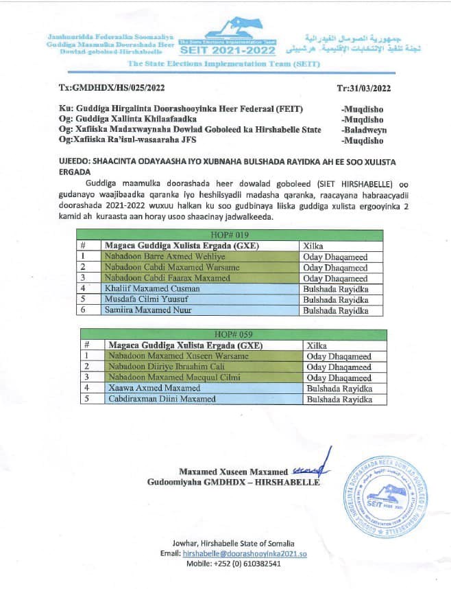 Khamiis, Maarso, 31, 2022 (HOL) - Guddiga doorashada maamulka Hirshabeelle ayaa goordhaw shaaciyay jadwalka doorashada laba kursi oo ka mid ah kuraasta Golaha Shacabka Baarlamaanka 11-aad ee dalka, kuwaas oo deegaan doorashadoodu tahay magaalada Baledweyne.