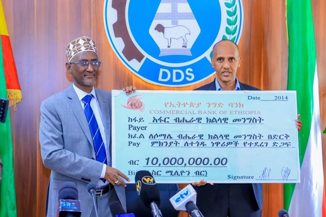 Jimco, May, 13, 2022 (HOL) - Dowlad degaanka Canfarta ayaa deeq lacageed oo gaaraysa 10 milyan ugu deeqay shacabka degaanka Soomaalida, deeqdan ayaa waxaa degaanka Soomaalida soo gaarsiiyay Madaxwaynaha degaanka Canfarta Awal Arbe.