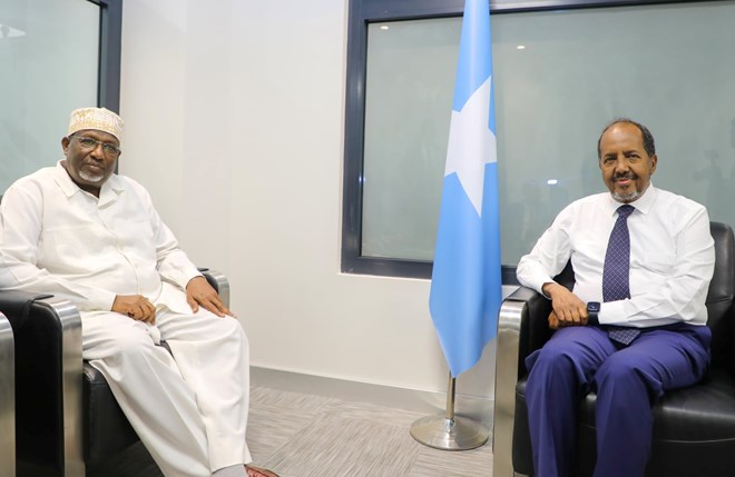 Isniin, May, 16, 2022 (HOL) - Madaxweynaha cusub ee dowladda Fedaraalka Soomaaliya Xasan Sheekh Maxamuud iyo guddoomiyaha Golaha Shacabka Sheekh Aadan Madoobe ayaa Maanta yeeshay kulankoodii ugu horeeyay.