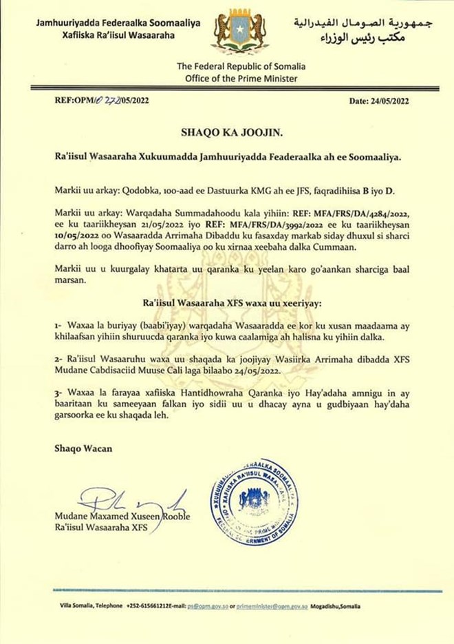 Talaado, May, 24, 2022 (HOL) - Raysal wasaaraha Xukuumadda Fedaraalka Soomaaliya Maxamed Xuseen Rooble ayaa shaqo joojin ku sameeyay Wasiirka Wasaaradda Arrimaha Dibadda Soomaaliya Cabdisaciid Muuse.