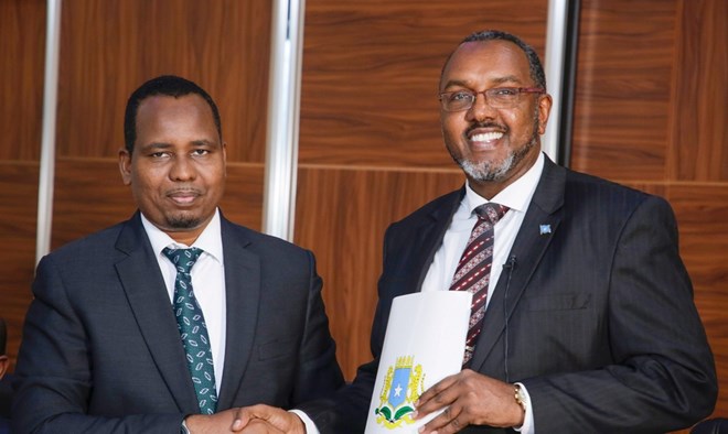 Axad, May, 29, 2022 (HOL) - Agaasimaha guud ee Madaxtooyada Qaranka Soomaaliya Xuseen Sheekh Maxamuud iyo Ku xigeenkiisa Maxamed Amiin Sheekh Cismaan oo dhawaan Madaxweyne Xasan Sheekh Maxamuud uu u magacaabay xilkaas ayaa munaasabad ka dhacday gudaha madaxtooyada Soomaaliya xilka kagala wareegay Agaasimihii hore Maxamed Cabdullaahi Ciise iyo ku xigeennadiisa Cabdinuur Maxamed Axmed iyo Cabdullaahi Sheekh Cabdikariin Daddoon.