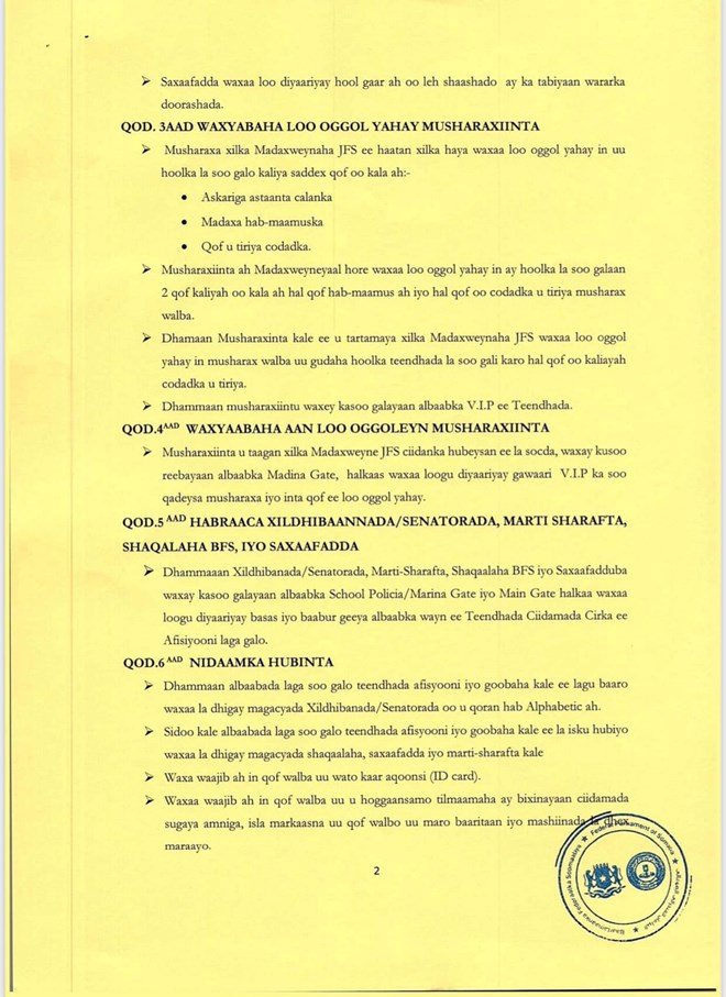 Isniin, May, 9, 2022 (HOL) - Guddiga qabanqaabada doorashada madaxweynaha Soomaaliya ayaa soo saaray habraaca amniga doorashada madaxweynaha goobta ay ka dhaceyso oo ah Teendhada Afisyooni ee magaalada Muqdisho.