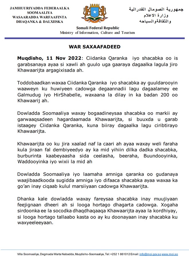 Jimco, November, 11, 2022 (HOL) - Dowladda Soomaaliya ayaa sheegtay inay Alshabaab maleegayaan falal amni darro oo aargoosi ah, kadib markii sida ay sheegtay uu jab xooggan uu kasoo gaaray howlgallada ka socda Galmudug iyo Hirshabeelle.