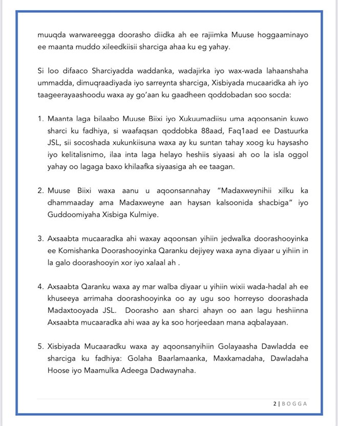 "Maanta laga bilaabo Muuse Biixi iyo xukuumadiisa uma aqoonsanin qaar sharci ku fadhiya, sii socoshada xukunkiisu waxay ku suntantahay xoog ku haysasho iyo kalidii talisnimo, inta la helayo heshiis siyaasi ah oo layska ogolyahay oo lagaga baxo khilaafka " ayuu yidhi Cirro.