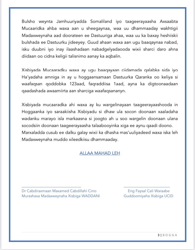 Axad, November, 13, 2022 (HOL) - Mucaaradka Somaliland ayaa ku dhawaaqay in ay gabi ahaanba kalsoonidii iyo aqoonsigii kala noqdeen madaxweynaha Somaliland Muuse Biixi Cabdi.