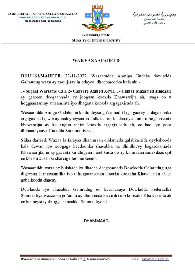Isniin, November, 28, 2022 (HOL) - Wasaaradda amniga maamul goboleedka Galmudug ayaa shaacisay magacyada saddex odey dhaqameed oo ay sheegtay inay u hoggaansameen kooxda Alshabaab.