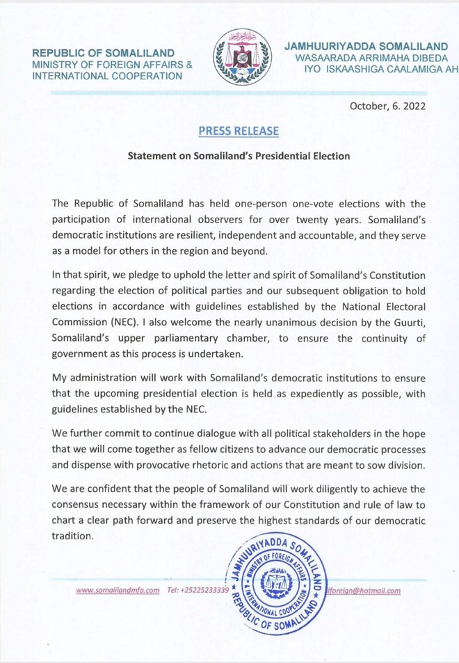 Khamiis, October, 6, 2022 (HOL) - Qoraal kasoo baxay Wasaarada Arrimaha Dibadda Somaliland, ayaa lagu sheegay in xukuumadu soo dhawaynayso muddo kordhinta iyo in doorashooyinka loo qaban doono sida ugu haboon ee ugu dhakhsaha badan.