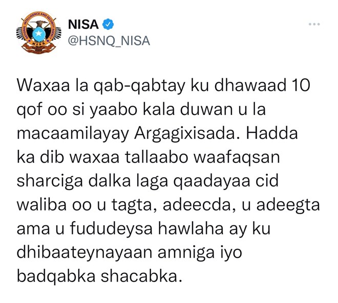 Axad, September, 25, 2022 (HOL) - Hay'adda nabad sugida iyo sirdoonka Soomaaliya ee NISA ayaa waxay shaacisay in la qab-qabtay ku dhawaad 10 qof oo si yaabo kala duwan u la macaamilayay kooxda Alshabaab.