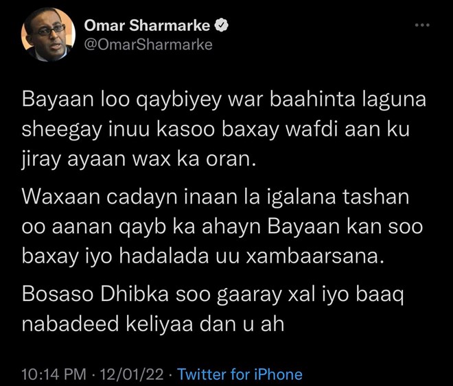Dhinaca kale raysal wasaarihii hore ee Soomaaliya Cumar Cabdirashiid oo kamid ah ergada dhex dhexaadinta ayaa isna ka hor yimid hadalka labada madaxweyne isagoo sheegay inuusan qeyb ka ahayn bayaanka ay soo saareen labada madaxweyne.