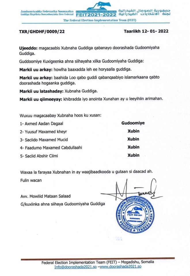 Khamiis, Janaayo, 13, 2022 (HOL) - Guddiga doorashada heer federal ayaa been abuur ku tilmaamay warqad baraha internetka lagu faafiyay oo la sheegay in xilka looga qaaday guddoomiyihii guddiga doorashada Galmudug, halka mid cusubna loo doortay.