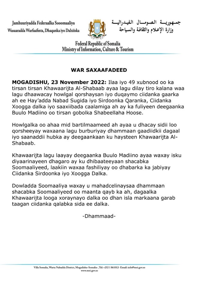 Arbaco, November, 23, 2022 (HOL) - Wasaaradda Warfaafinta Xukuumadda Fedaraalka Soomaaliya ayaa goordhaw shaacisay in howlgalo qorsheysan iyo duqeymo cirka ah oo ay ciidamada xoogga dalka, kuwa Nabadsugida iyo Sirdoonka Qaranka oo kaashanaya saaxiibada Caalamiga ah ka sameeyeen gobolka Shabeellaha Hoose lagu dilay dagaalamayaal badan oo ka tirsan Al-shabaab.