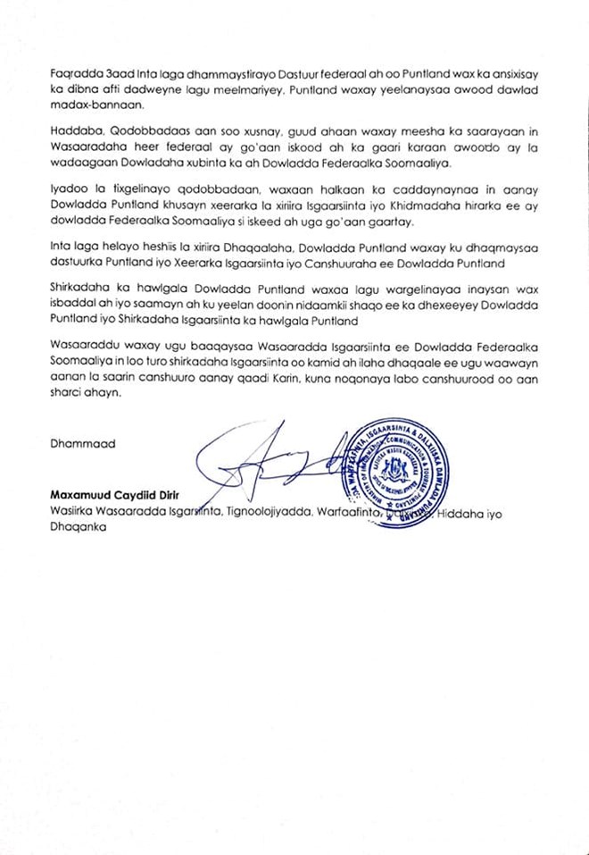 Wasaaraddu waxay fartay shirkadaha isgaarsiinta ee Puntland in aanay wax isbeddel ah ama saamayn ah ku yeelandoonin sharciyada kasoo baxay Dowladda federalka Soomaaliya.
