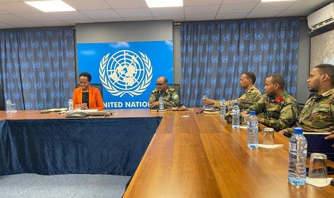 Sabti, Agoosto, 12, 2023 (HOL) - Taliyaha Ciidanka Difaaca Soomaaliya (CDF), Jen. Ibraahim Sheekh Muxuyidiin ayaa la kulmay saraakiil sare oo katirsan xafiiska Qaramada Midoobay ee Soomaaliya.