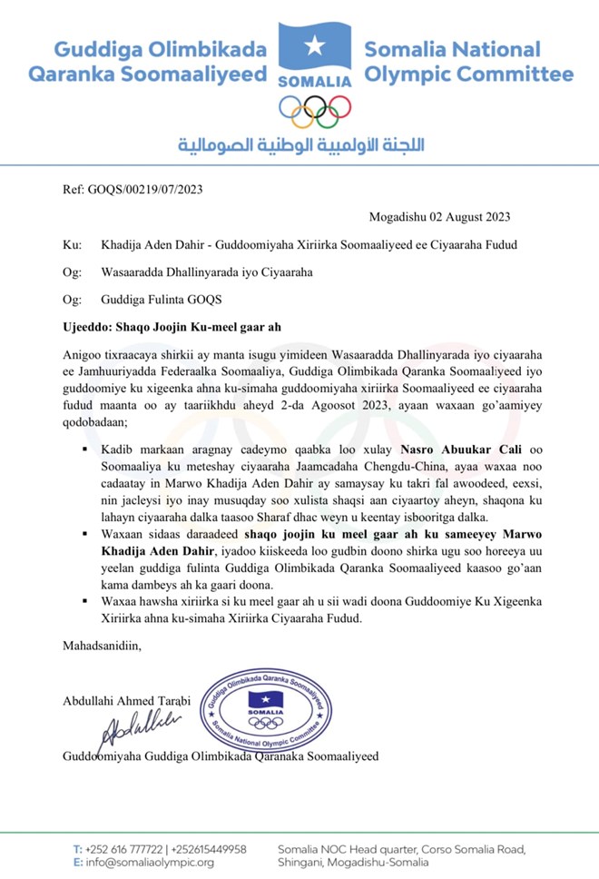 newsinsideSababta shaqada lagaga joojiyay, ayaa lagu sheegay, kaddib markii lagu eedeyay inay ku takri fal awoodeed iyo eex u martay inay Sahro Abuukar u magacowdo cayaaryahannada Soomaaliya ku matalaysa tartanka orodada ee Shiinaha ka socda.