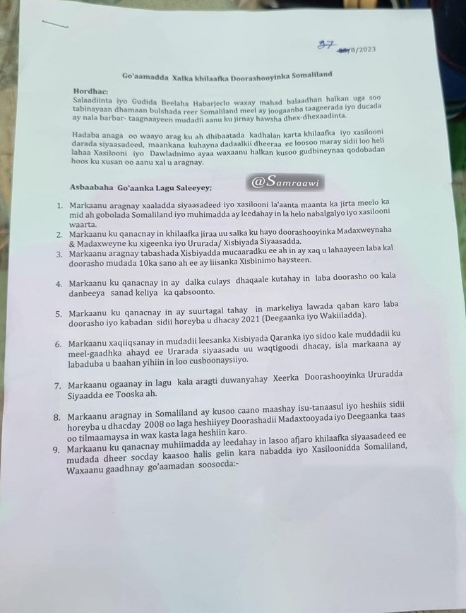 Axad, Agoosto, 27, 2023 (HOL) - Hoggaanka Dhaqanka ee Beesha Habar Jeclo oo loo xilsaaray in ay go'aan xal ah kasoo saaraan khilaafka siyaasadeed ee Somaliland ka taagan, ayaa ku baaqay in la isku sidko doorashooyinka ururada iyo madaxtooyada.