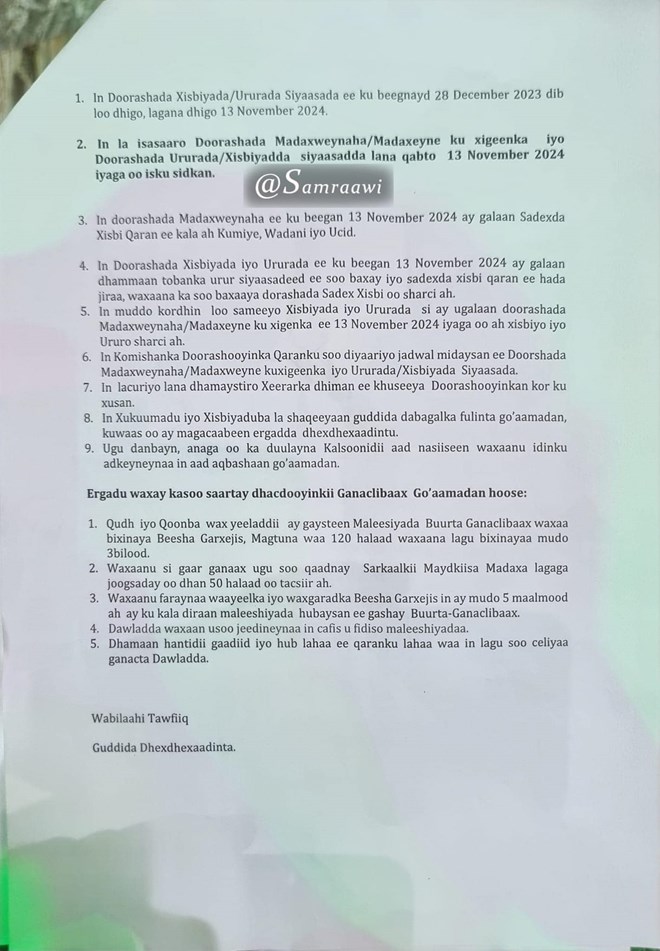 Hadaba, hoggaanka dhaqanka ayaa go'aamiyay in doorashada ururada dib loo dhigo oo doorashada madaxtooyada iyo ururadaba laysa saaro lana wada qabto 13 November, 2024, iyo in doorashada madaxweynaha ay galaan kali ah xisbiyada Kulmiye, Waddani iyo UCID.