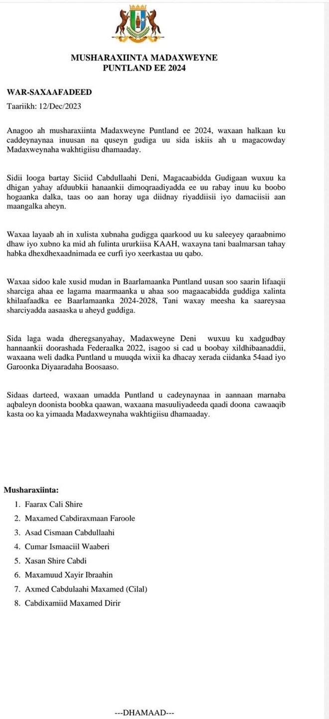 Arbaco, December, 13, 2023 (HOL) - Qaar kamid ah musharraxiinta madaxtinimada Puntland ayaa ka horyimid guddiga ansixinta baarlamaanka iyo xallinta khilaafaadka doorashada ee uu shalay magacaabay madaxweyne Deni.