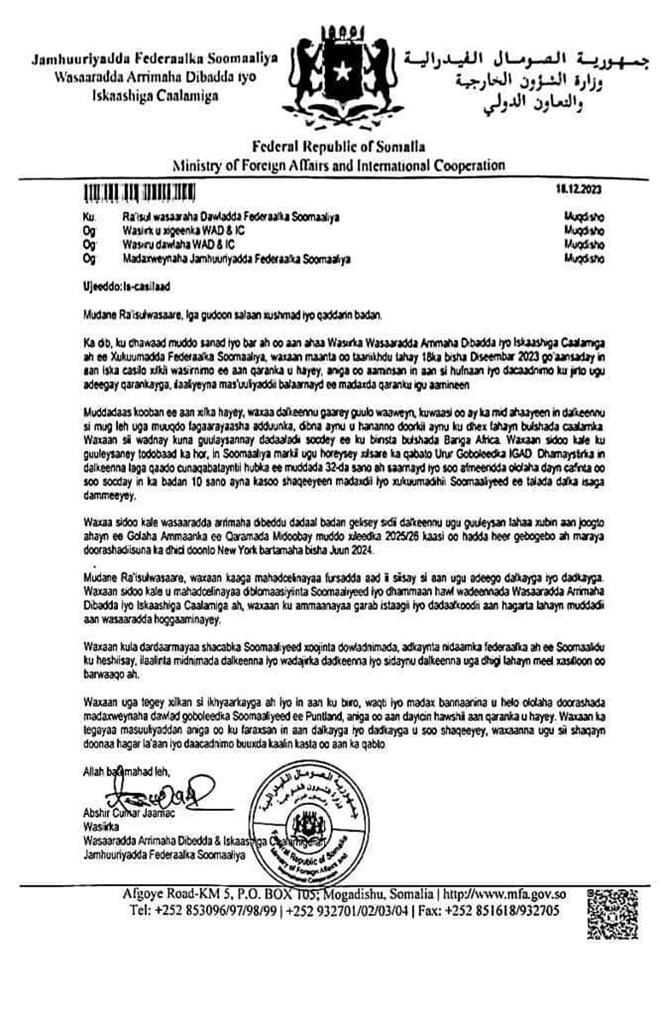 Isniin, December, 18, 2023 (HOL) - Wasiirka arrimaha dibadda dowladda federaalka Soomaaliya, Abshir Cumar Haruuse ayaa si rasmi ah u shaaciyay inuu iska casilay xilkiisii, isagoona warqaddiisa iscasilaada ah u gudbiyay raysal wasaare Xamse Cabdi Barre.