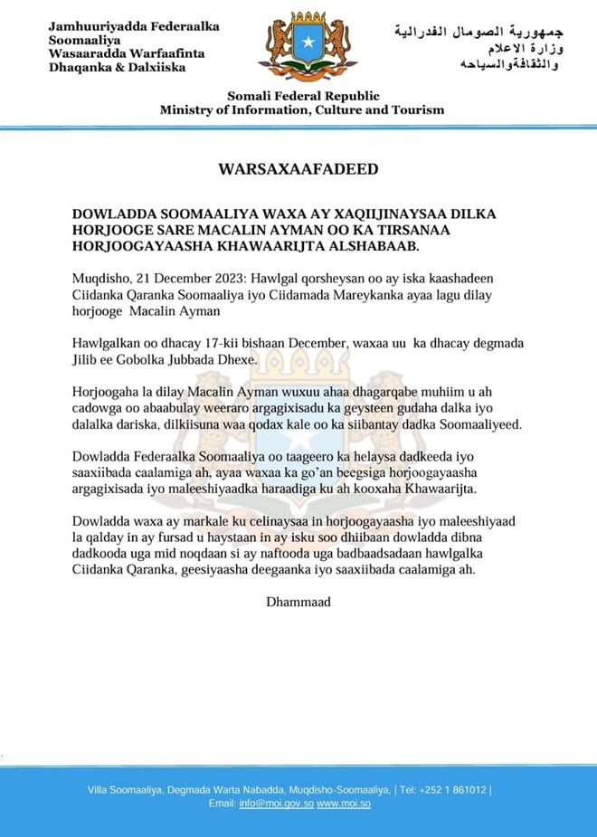 newsinsideDowladda Soomaaliya ayaa sheegtay macalin Ayman inuu ahaa horjooge ka dambeeyay abaabulka weeraro Shabaabku ka geysteen gudaha dalka iyo dalalka dariska, dilkiisuna uu yahay qodax ka siibantay dadka Soomaaliyeed.