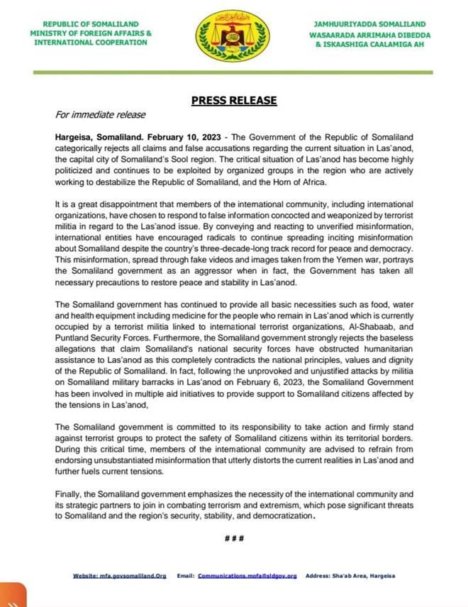 "Xukuumada Somaliland waxay iska fogaynaysa sheegashooyinka iyo eedaha beenta ah ee la xidhiidha xaalada hada ee Laascaanood, xaalada Laascaanood aad ayaa loo siyaasadeeyay, waxaana si qaldan uga faa'iidaystay kooxo abaabulan oo gobolka ah".