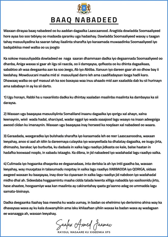Salaax wuxuu Somaliand ugu baaqay inay joojiso maquuninta shacabka islamarkaana wuxuu sheegay in hoggaankeeda looga baahan yahay inuu qaato go'aano adag oo ummadda lagu badbaadinayo.