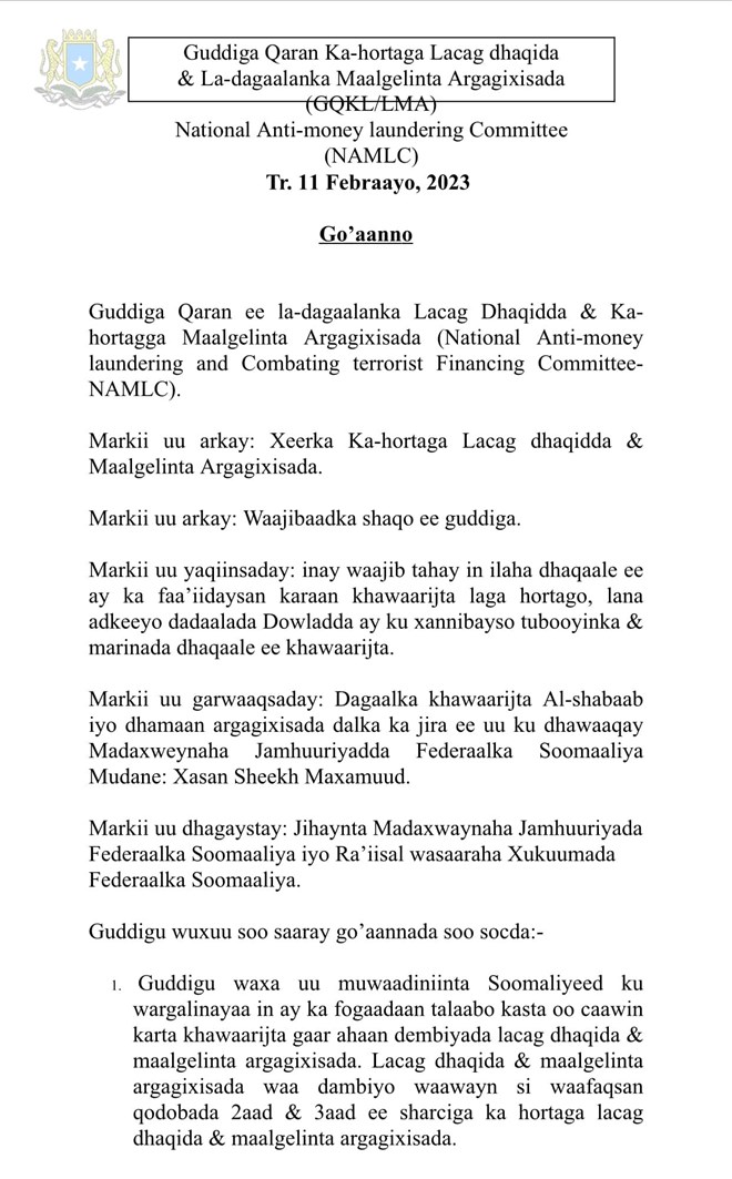 Talaado, February, 14, 2023 (HOL) - Guddiga la-dagaalanka Lacag dhaqidda & Ka-hortagga Maalgelinta waxa loogu yeero Argagixisada ee dowladda Soomaaliya ayaa shacabka ku wargaliyay in ay ka fogaadaan tallaabo kasta oo caawin karta kooxda Alshabaab.