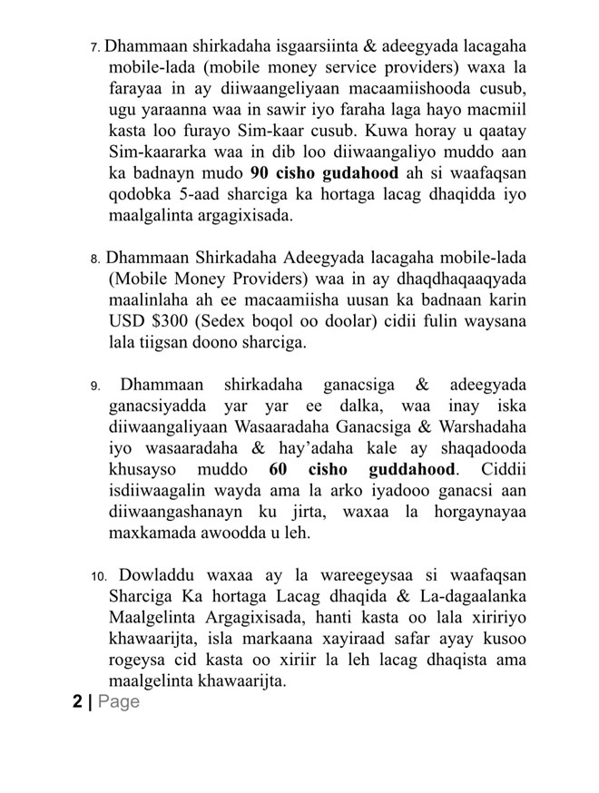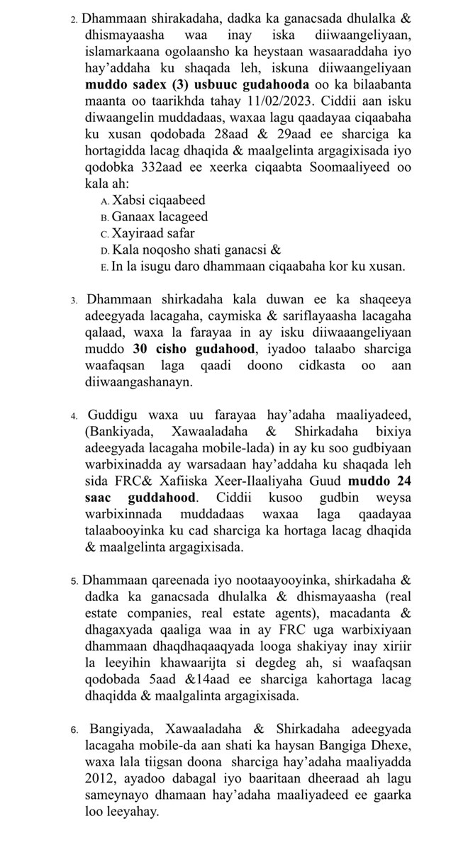 Guddigan ayaa sidoo kale kusoo rogay shirakadaha ganacsiga, dadka ka ganacsada dhulalka & dhismayaasha inay iska diiwaangeliyaan wasaaraddaha iyo hay’addaha ku shaqada leh muddo sadex 3 usbuuc gudahooda ah.